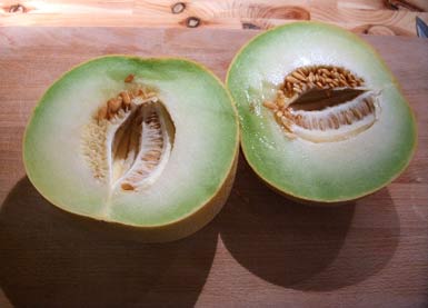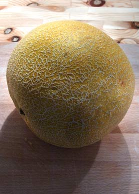Exotische Frucht aus dem Handel, saftig und süß. Unterart der Netzmelone Sie ist reif, wenn sie auf Druck mit dem Finger leicht nachgibt, sich aber noch nicht weich anfühlt.