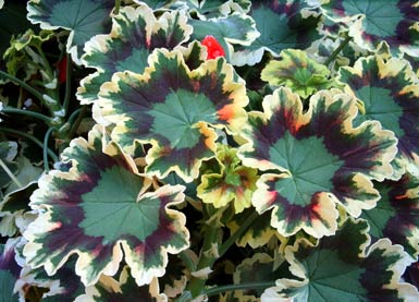 Pelargonie fancy leaf pelargonium fancy leaf geranium Pelargonium "contrast" und andere Storchschnabelgewächse Besondere Zuchtformen der Pelargonien, die zwar auch hübsch blühen, sich aber nicht durch besondere oder große Blüten, sondern durch meist auffällig gezontes, mehr- |