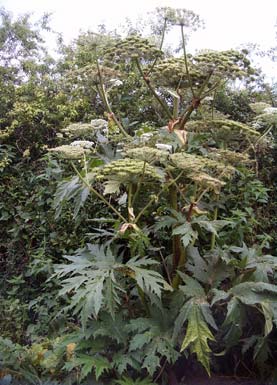 Giftiger Gigant, hier 3m-Exemplar, Pflanzensaft verursachtHautreizungen, vor allem in Verbindung mit Sonneneinstrahlung.