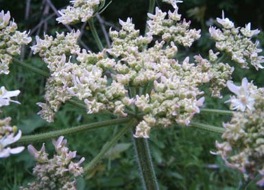 Haarige Stängel, auffällige Hüllblätter, große weiße Dolden im Juni