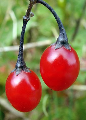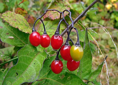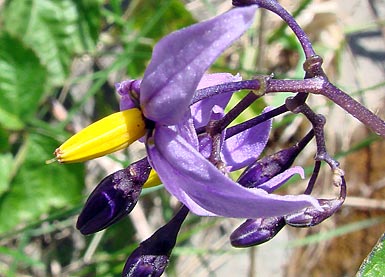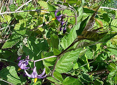 Nachtschatten trailing bittersweet Solanum dulcamara Lippenblütler Lamiaceae Bis zu tödlich giftiger Kletterer Blühend von Juni bis etwa August Beeren gleichzeitig mit den Blüten ab August bis in den Herbst Verwandt mit Nutz- pflanzen wie Tomate und Kartoffel, aber auch mit der Tollkirsche Besonders Kinder sollten auf die Gefahr aufmerksam gemacht werden, da die Pflanze nicht so selten ist und die Früchte so hübsch aussehen Findet man an und in feuchten Gebüschen, Wiesen und an Ufern Bei geeigneter Rank- möglichkeit wohl bis zu 2 m hoch, ich habe allerdings nur ca. 60 cm hohe Exemplare gefunden Blattunterseiten behaart |