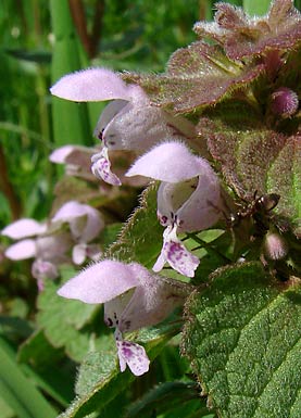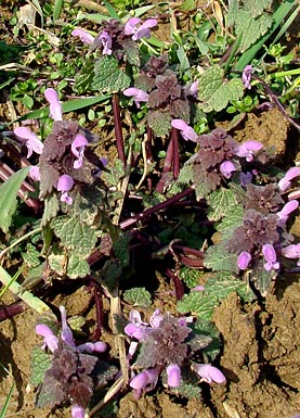 purple deadnettle Lamium purpureum Lippenblütler Lamiaceae Blüte ab Juni 10 - angeblich 40 cm hoch Habe aber bisher nur deutlich niedrigere Exemplare gefunden Gärten, Wiesen, Äcker, Wegrand, Schuttplätze, stickstoffreiche Böden Bei der Purpur-Taubnessel sind immer die obersten Blätter mit rötlich gefärbt Unangenehmer Geruch beim Zerreiben der Blätter |