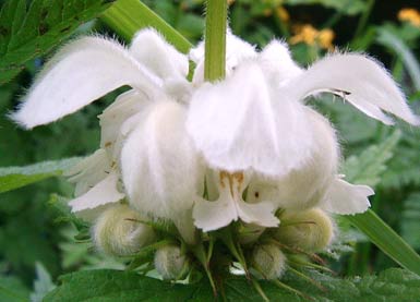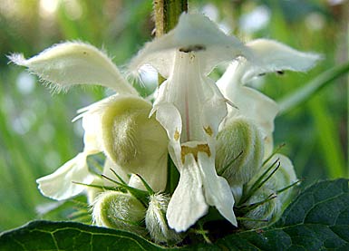 white deadnettle Lamium album Lippenblütler Lamiaceae Blüte ab Mai bis in den Herbst Bis ca. 60 cm hoch Wiesen, Äcker,Weg- ränder, Mauern, Hecken Haarige schneeweiße, eigentlich bei genauem Hinsehen wunderschöne Blüten Heilpflanze: innerlich als Tee gegen Verdauungsprobleme, Blasen- und Frauenleiden, äußerlich als Umschläge gegen Ausschläge und Hautkrankheiten |