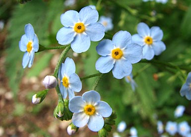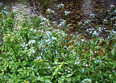 water forget-me-not Myosotis palustris Borretschgewächse Boraginaceae Am Rande von stehenden und fließenden Gewässern Auch beliebt zur Bepflanzung von Gartenteichen Bis ca. 50 cm hoch Blüht ab Mai bis ca. Juli und im Spätsommer manchmal ein 2. Mal Der ausnahmsweise aus dem Griechischen stammende Name Myosotis ist zusammengesetzt und bedeutet Mauseohr! Was sich auf die Form der Blättchen bezieht. |