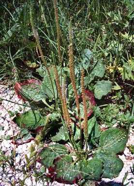 Großer Wegerich broadleaf plantain Plantago major Wegerichgewächse Plantaginaceae Blütezeit ab Juni über den ganzen Sommer Wege, Pflasterfugen, Wiesenränder, Ufer, Viehweiden, Geröll, Schotter Am liebsten auf verdichteten Böden, deshalb oft an stark betretenen oder befahrenen Stellen Heilpflanze zur Verwendung mit Umschlägen aus den Blättern: Bei allen Entzün- dungen, Verbrennungen und Ausschägen der Haut, hauptsächlich juckreiz- mindernd und entzündungshemmend |