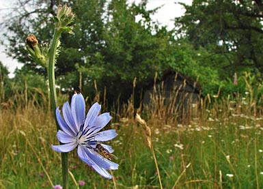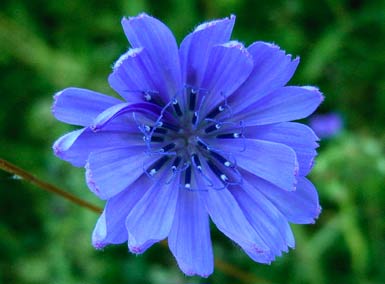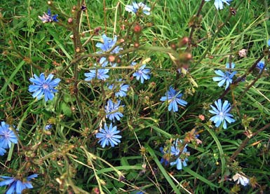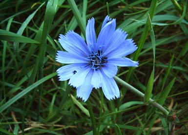 common chicory Cichorium intybus Korbblütler Asteraceae Blühend gefunden von Juli bis Oktober Bis ca. 95 cm hoch Am Wegrand und auf Schutt- und Ödflächen, aber auch auf saftigeren Böden wie Weiden gefunden Die Wegwarte hat außer der gezeigten Wildart noch 2 andere Unterarten, so die Kaffeezichorie und unseren Chicoree, der als Salat auch heute beliebt ist Altes Heilmittel, früher gegen fast alles empfohlen, es lässt sich kaum alles aufzählen Die Blüten sind nachts geschlossen und folgen tagsüber dem Lauf der Sonne (Heliotropismus) |