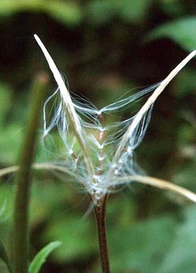willow herb Epilobium parviflorum Nachtkerzengewächse Onagraceae Blütezeit Juli & August Bis ca. 95 cm hoch Braucht feuchten Standort, Wald, Wiesen, Gräben & Ufer Volksheilmittel: als Tee gegen Blasenleiden ein- gesetzt, der wissenschaft- liche Beweis für die Wirk- samkeit fehlt allerdings. Der vierkantige Teil unterhalb der Blüte ist kein Stiel, sondern der lang gestreck- te Fruchtknoten, der bei Reife, wie man unten sehen kann, viele haarige Flugsamen entlässt. |