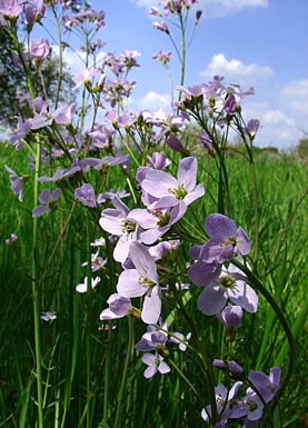 cuckoo flower Cardamine pratensis Kreuzblütler Brassicaceae Blütezeit Mai Oft massenhaftes Auftreten im Frühjahr in eher feuchten, nährstoff- reichen Wiesen, auch am Teichrand Bis ca. 60 cm hoch Blüten fast weiß bis zart rosa Vermehrung über Samen, die reif aus Schoten geschleudert werden oder aber ungeschlechtlich über wurzelnde Brutknospen Name kommt von den Schaumnestern der Schaumzikade, die bevorzugt am Wiesenschaumkraut abgelegt werden |