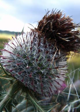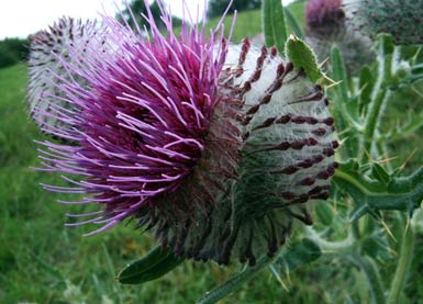 Ganz bizarres Gerät mit wunderbar regelmäßigen, wollig behaarten Knospen. Die eigentlichen Blüten sind anderen lila Disteln sehr ähnlich. Blüte im Juli/August