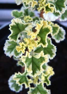 Straff aufrechte, schnell verholzende Zweige. Wächst völlig anders als die meisten Duftpelargonien. Sehr kleine, gelb-weiß panaschierte harte Blättchen. Ganz starker, wunderbar reiner Zitronen-Blattduft!