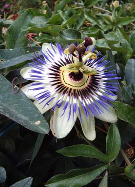 Rankpflanze mit spekta- kulärer Blüte, die mit der leckeren Maracuja verwandt ist. Jedem Teil der Blüte wurde eine Deutung aus der Passion Christi zugeordnet. Nägel, Dornenkrone usw.