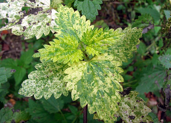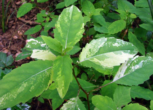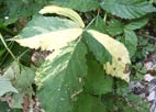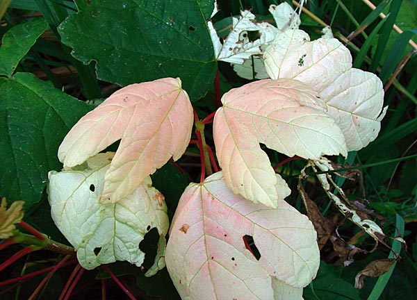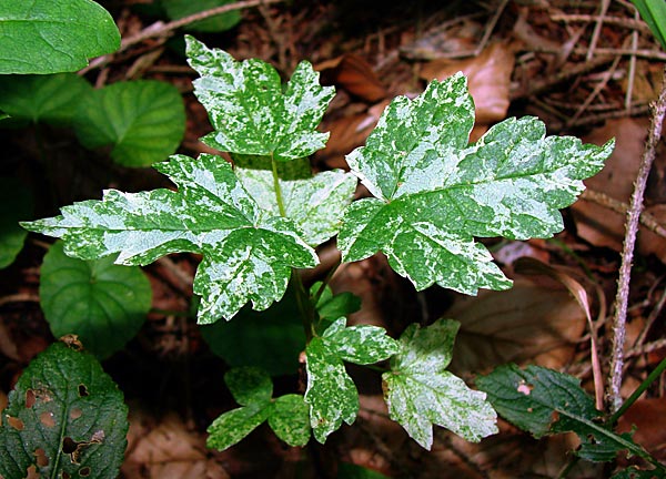 In Wald und Wiese fallen mir immer wieder Beispiele von Wildpflanzen mit Farbveränderungen auf. Besonders häufig scheint das beim Ahorn der Fall zu sein, ich habe aber auch gestreifte oder gefleckte Buchen, Flockenblumen, Liguster, Brombeeren, Großes Springkraut, Brennesseln und eine ganz weiße Albinoform bei einer Eiche gefunden. Bei der gezielten Züchtung von Zimmerpflanzen kennt man ja viele Formen mit grün-weißen, grün-gelben, grün-silbernen und anderen mehrfarbigen Blättern, aber in der Natur? Wie kommt das zustande? Meine Frage an den Botanischen Garten Bochum lautete deshalb: